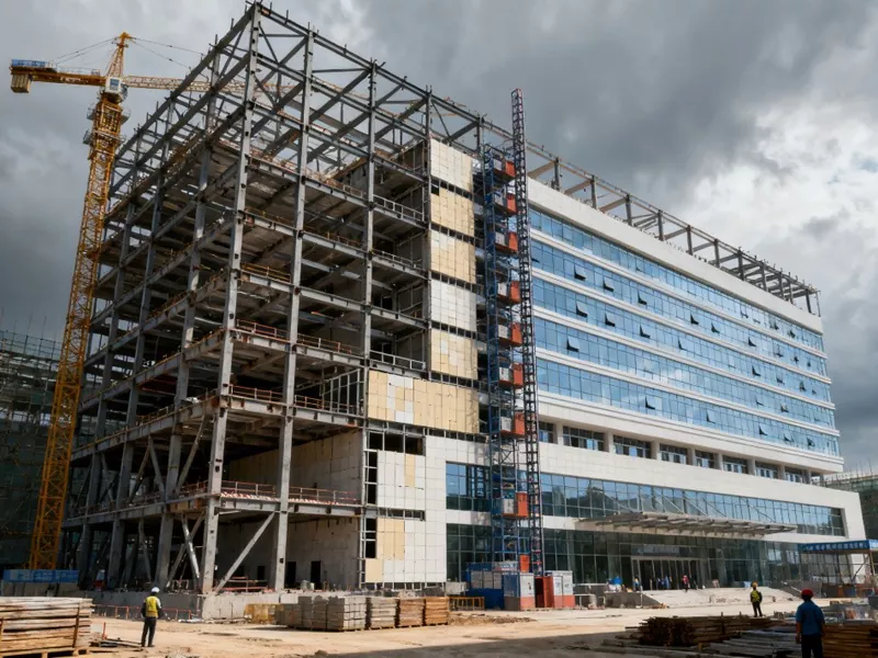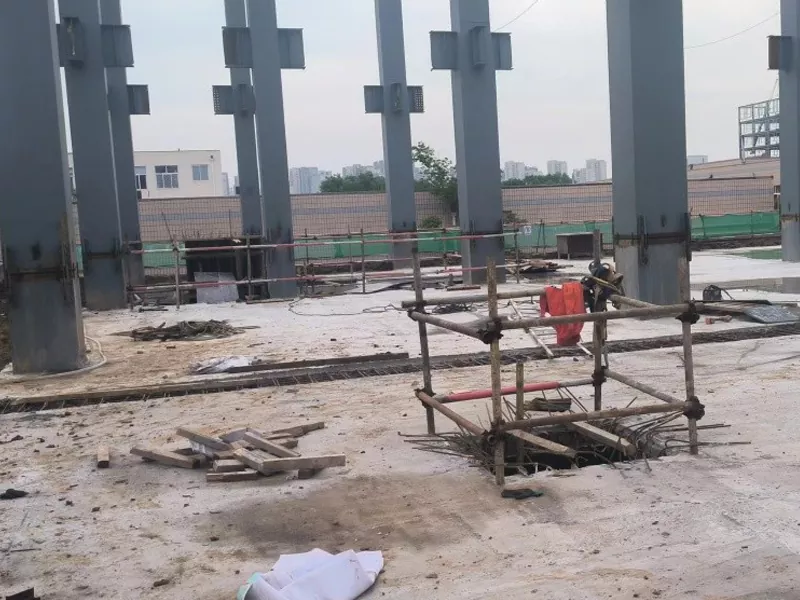 3. Instalacja na miejscu: Podczas gdy komponenty są prefabrykowane w fabryce, zespół konstrukcyjny wstępnie zakopuje śruby kotwiące na placu budowy, aby zakończyć wstępne zakopywanie fundamentu. Na koniec przeprowadzany jest montaż wielopiętrowego prefabrykowanego metalowego budynku szpitala.
