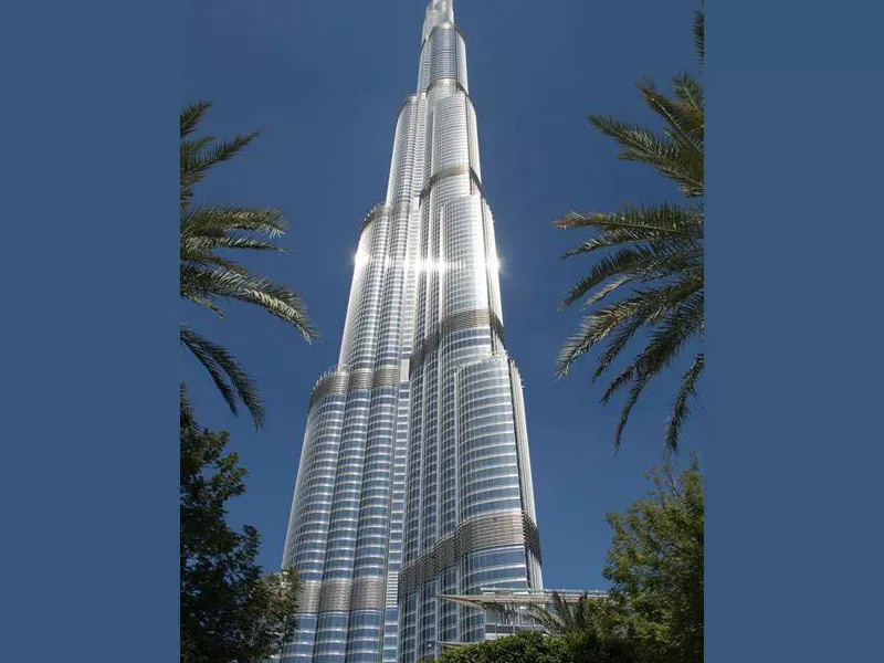 ● Burj Khalifa w Dubaju w Zjednoczonych Emiratach Arabskich jest najwyższym budynkiem na świecie, z hybrydową ramą stalową. Stoi na 163 piętrach i ponad 828 metrów wysokości.